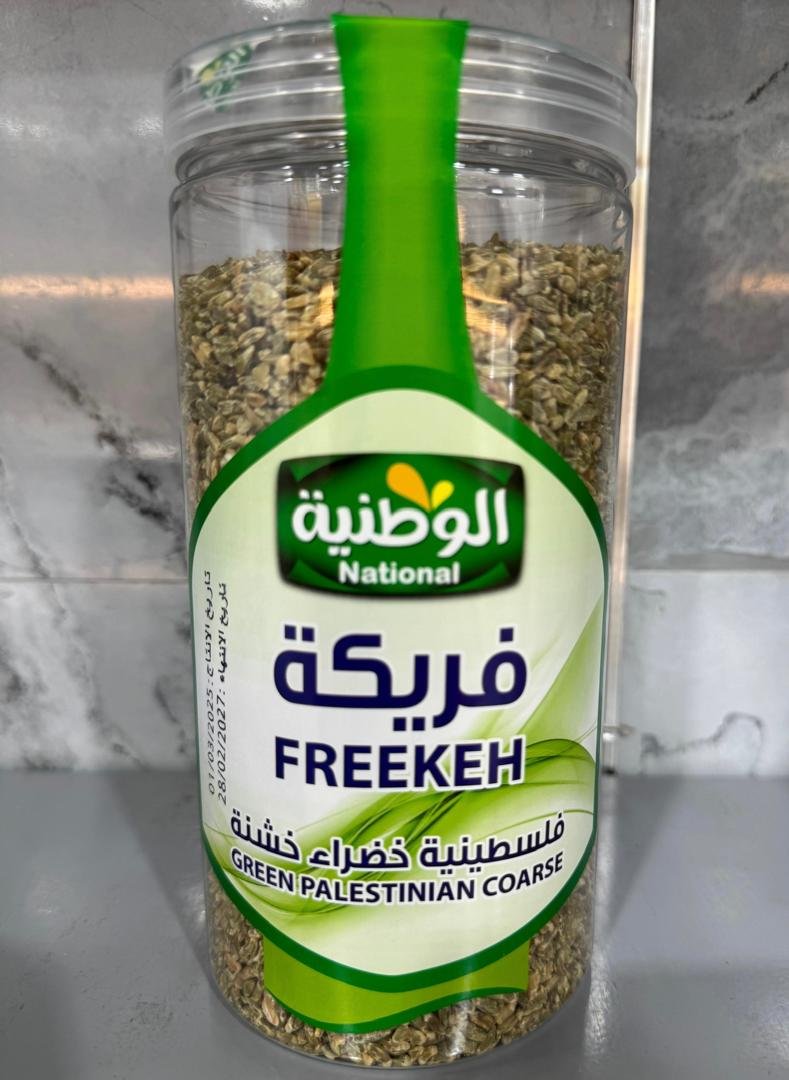 Freekeh (national) or farik is a food product made from green wheat grains. The cobs are harvested while still green and tender before being dried and roasted. They are then ground into hard, ground grains similar to dried wheat grains, and are larger than bulgur. Cooking recipes for freekeh vary from region to region. It is cooked like bulgur or made into soup in the Levant, Iraq, Egypt, Algeria, and other countries. Net weight: 500g