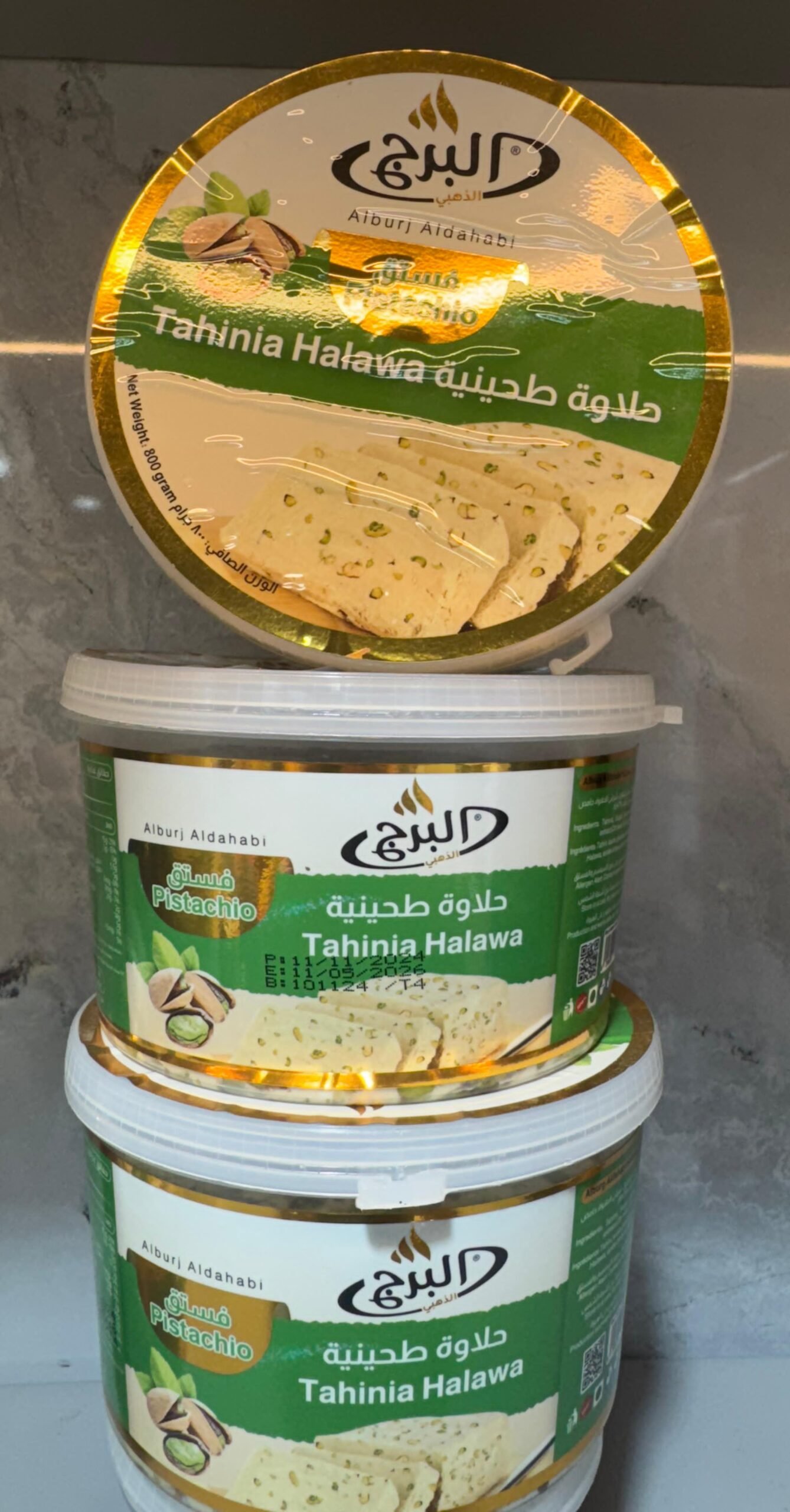 tahinia halawa “alburg aldahabi” For those who love halva and pistachios, this version has an extra amount of pistachios to make this wonderful dessert even more delicious, and it is nutritious and energy-rich due to its ingredients. ingredients : tahin . sugar . glucose . halawa root . extract . citri acid . vanilla . pistachio . E 471 allergen alert, contains sesame seeds & pistachio store in a cool , dry place away from sunlight production and expiry date is printed on the packaging net weight (800) gram